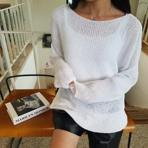 상상그이상 여성용 국내제작 시스루 입술넥 긴팔니트 여리여리 끝판왕 루즈핏 롱기장 그물니트 간절기 날씬해보이는 보트넥 골지니트